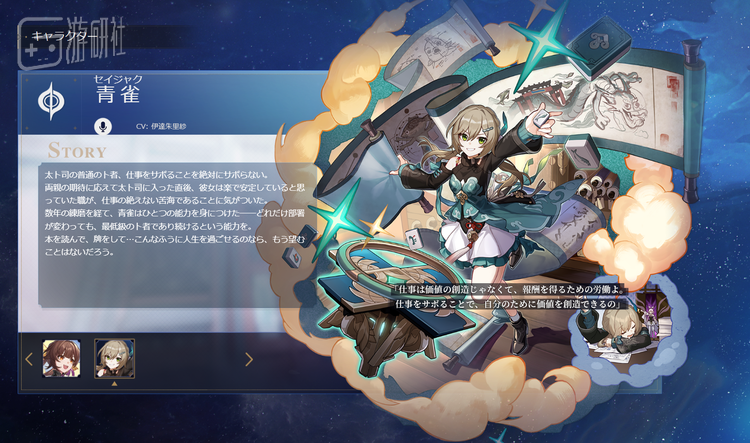 举例来说,《崩坏:星穹铁道》里有一位热衷打麻将的角色名叫“青雀(seijyaku)”,在打造该角色的时候,我们观察了身边的麻将发烧友,“喜欢麻将的人平时是怎么行动的?”“喜欢麻将的人会讨厌什么?”,然后将此类特征融入到了角色身上。(笑)。