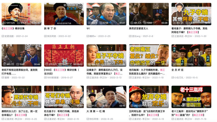 然而,伴随着去年中旬以来《雍正王朝》二次元创作的爆红,此前各大影视解说UP主精讲类作品的人气,以及原剧集的网络点播数一路飙升。在万物皆可鬼畜的B站,播放量排名靠前的“雍正”主题原创视频,居然大部分都是严肃类的解说节目。