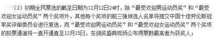而成为候选人还需要进行一轮投票,高票者进入提名名单,最终这份提名名单将结合网络和手机投票情况以及组委会意见,由关心、支持体育事业的社会人士(20人)组成的评委会,评选产生10位"年度十大体坛风云人物奖"获得者。