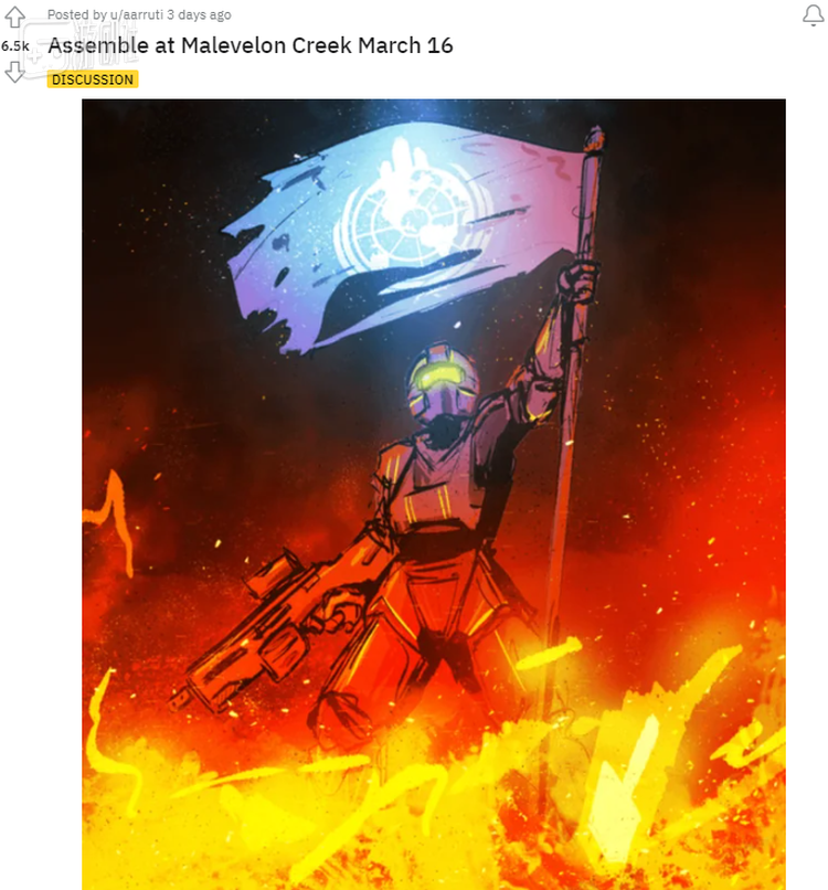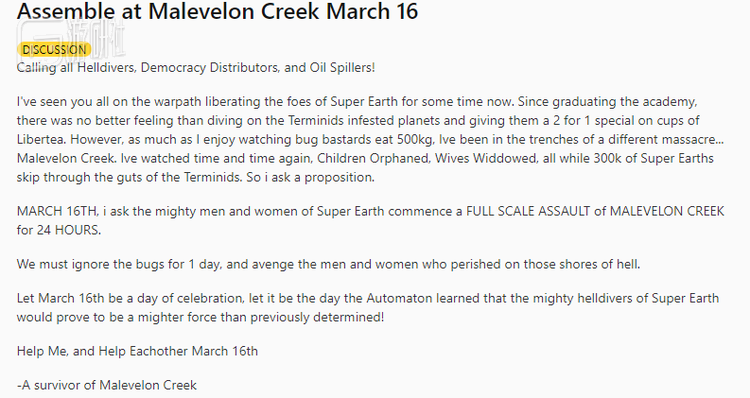 帖子通篇情绪激昂,结合游戏中的设定,以“士兵”的荣誉和财富为目标试图动员服务器里的玩家,在16日这天和他一起去麦拉芬蒙河激战24小时,争取历史性的拿下这个星球。
