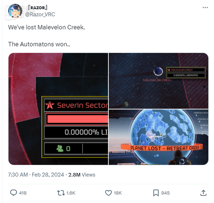 此事一出玩家社区一片哗然。考虑到玩家人数有限,玩家数量对于星球解放度来说至关重要,社区常常出现玩家为集中人力攻克哪一星球而意见不一的状况,而系统也经常会有两个星球重要星球陷落,更让玩家在选择间不断拉扯。现在看来很难不怀疑这一切是“乔”在其中作祟,以达到拖慢玩家游戏进度的目的。
