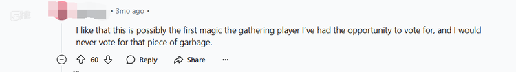 “我喜欢有机会投票给第一个《万智牌》玩家(这件事),但我绝对不会投票给那个垃圾(指万斯)”