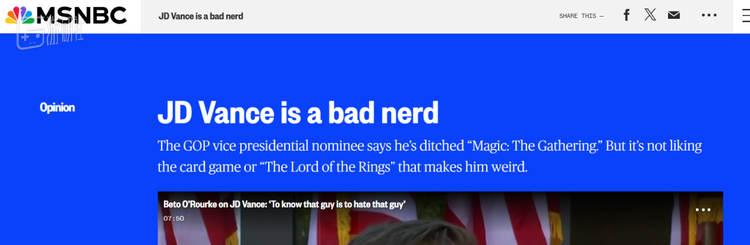 例如MSNBC上这篇文章,毫不掩饰的上来就“先喷为敬”,称万斯为nerd(怪胎、怪咖——请不要AOE其他牌佬了)。