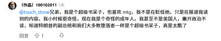 在得知“万斯玩《万智牌》”这一消息后,一些玩家立场“较左”的玩家则在不同渠道上发表的自己看法,其中也无外乎对于万斯本人的敌意,并试图将其切割出《万智牌》群体中: