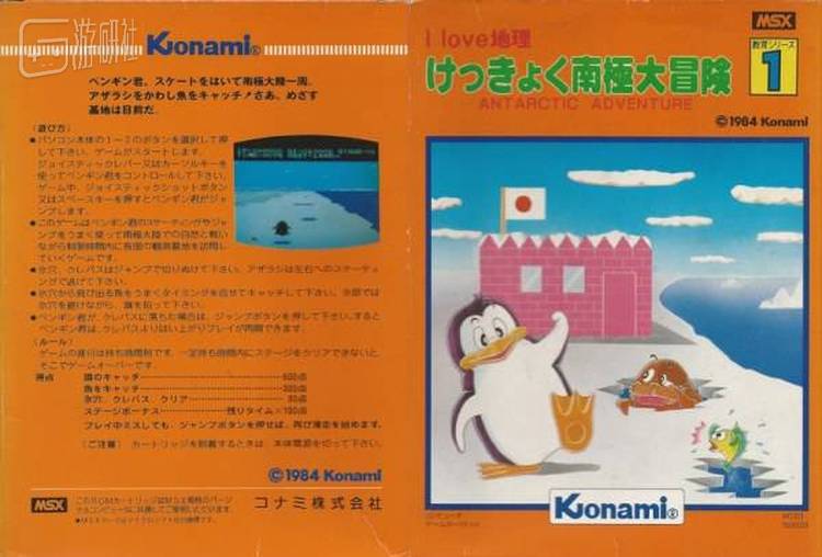 在MSX版《南极大冒险》的封面上,企鹅的模样还比较正常,像个乖宝宝,才不像FC版那样一脸坏样。在正式标题前还有一句铁定要被英语老师骂的英文——“I love 地理”。