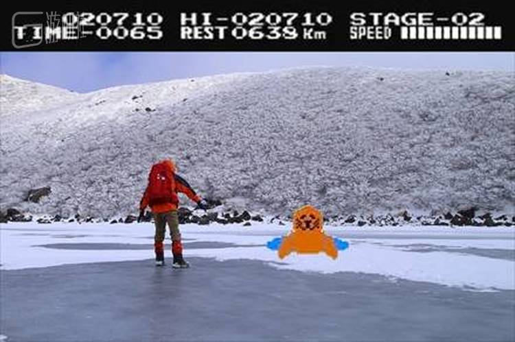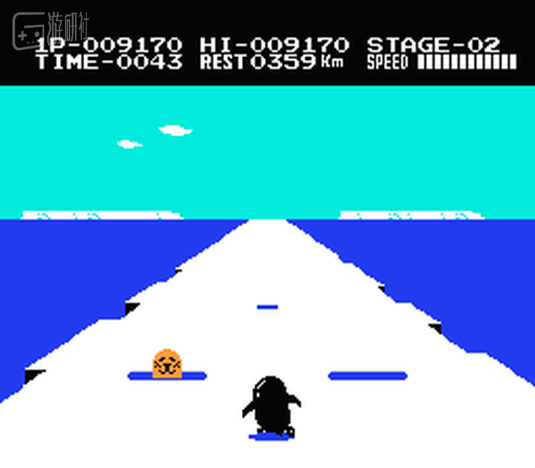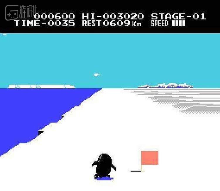 《南极大冒险》的中间一关,被标注为南极点,这也是游戏的转折点。从这一关之后,游戏的难度陡然上升,如果一味加速不注意减速,很容易连续掉进沟里,永世不得翻身。其实美国人早在1957年,就在南极点建立了阿蒙森·斯科特站,但是鸡贼的日本人并没有在那里升起星条旗,而是用一面企鹅的旗帜代替,还让企鹅做了一个很猥琐的庆祝动作。要知道,整个游戏里面,这只企鹅只在南极点和日本站做出这样的动作。