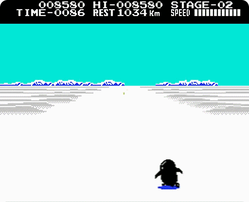 《南极大冒险》这个译名是直接从日文标题里拿来的,尽管游戏里显示的是英文。其实日文名字前还有一个词,完整的名字应该是“结局 南极大冒险”。据说这个名字的灵感来自松下电器的空调广告词——“结局、南极、放送局”。这个传闻真实性不可考,但有一点可以确定,《南极大冒险》一开始就不是按照游戏软件的标准来做的。