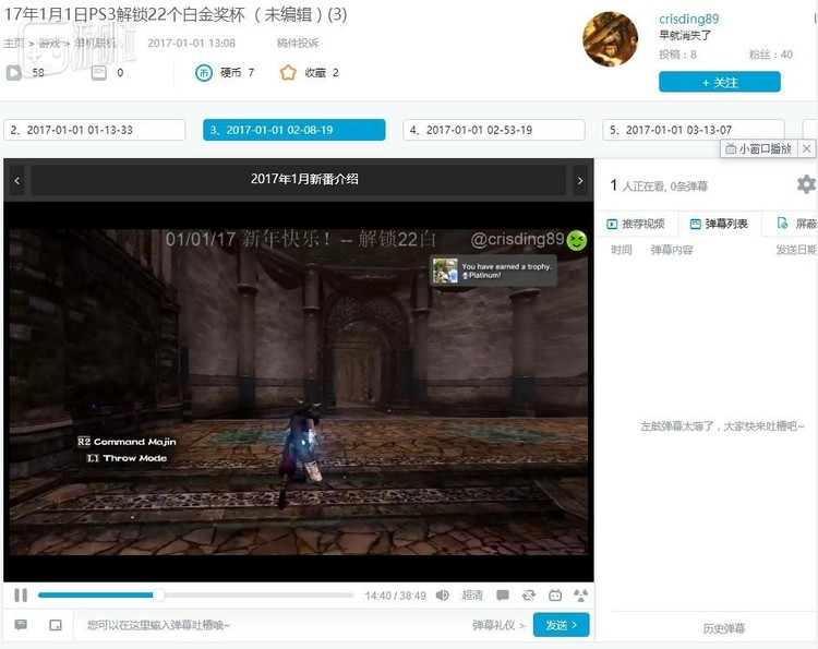 2017年元旦那天,他一口气拿下了22枚白金,为了纪念这些精彩的时刻,他特意录制了游戏的全部过程。这22个白金的游戏都不是所谓的“白金神作”,各需要几十个小时才能完美。在录制视频之前,把游戏打到“准白金”的状态也花费了近两个月。