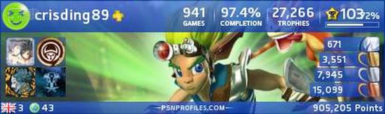 他在英国服务器排名第三,PSN的等级已突破上限,目前拥有671枚白金奖杯,玩过941款游戏,并且保持着97.4%的完美率。