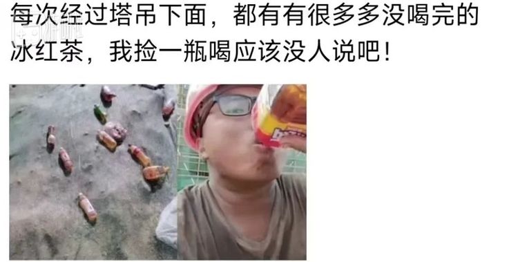 毕竟塔吊太高了,导致操作师傅下来上厕所很麻烦,便习惯将冰红茶瓶“物尽其用”,完成某种液体循环。