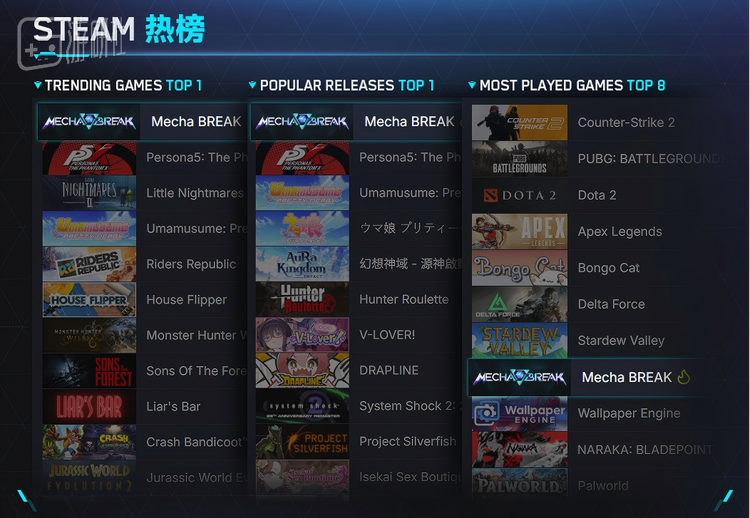 游戏上线后数小时,Steam在线数很快就突破了13.2万,登上了Steam热销榜前6,新游榜第一。机甲爱好者们热情地谈论着游戏的方方面面,分享自己驾驶爱机的精彩瞬间或是精心打造的涂装方案,欢天喜地如同过节一般。