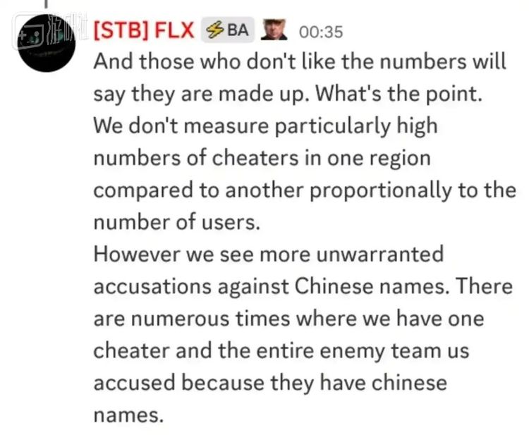 “我们并没有观测到某个地区的作弊者数量在与用户总数成比例的前提下,相比其他地区特别高。然而,我们确实看到越来越多针对中文名字的不实指控,有很多次,我们明明只发现一个作弊者,但整支敌方队伍都被指控作弊,只因为他们的ID是中文……”