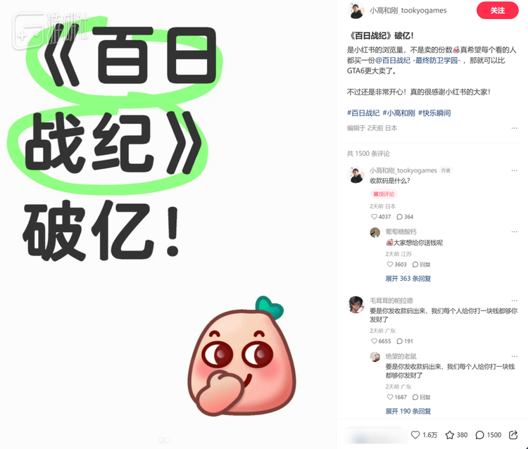 但事实上,在小高和刚本人的努力营业之下,他正逐步成为中文网络上,最知名的日本游戏制作人之一。并带动《百日战纪》词条在小红书的浏览量突破了亿级。各平台上发的推文点赞数也是动辄上万。