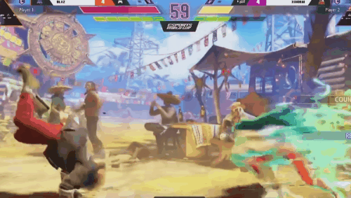 但这个操作同样要冒极大的风险,上面我说的“稍微延迟一段时间”,实际上指的是“精确延迟到第15或16帧”,因为如果少于15帧,攻击会直接打空,给Blaz一个完美的确反机会,多于16帧,帧数差仍然只有“+1”,Blaz的选择依旧有优势。