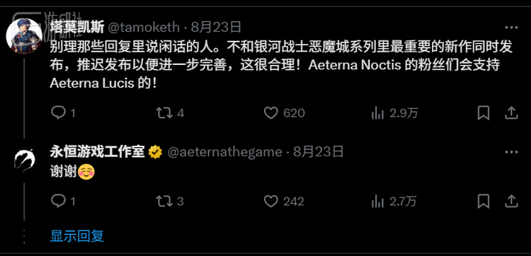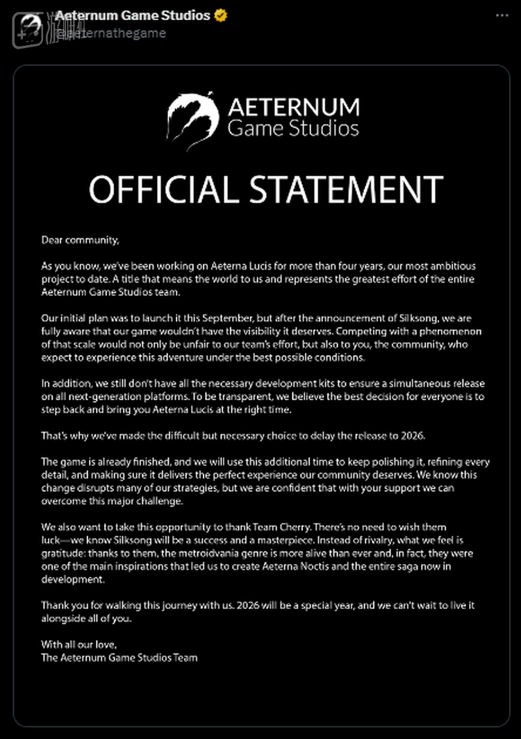 比如原计划9月发售的《Aeterna Lucis》,在《丝之歌》公布发售日当天,便在推特上发表了声明,宣布将一路推迟至2026年发售,部分原因是“为了避免受到《丝之歌》影响”。
