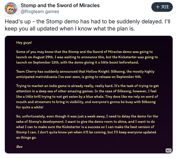 就连一些尚未进入发售阶段的游戏,也因为《丝之歌》的突然到来显得大为苦恼:《Stomp and the Sword of Miracles》原本计划在8月底开启众筹、9月初发布试玩Demo,如今因为《丝之歌》发售,宣布了推迟众筹时间。