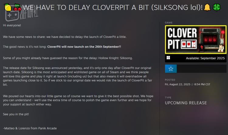 除了银河恶魔城游戏,也有一些其他类型的游戏选择了躲避《丝之歌》的锋芒:“小丑牌Like”游戏《CloverPit》,原本计划在9月3日发售,如今推迟到了9月26日。