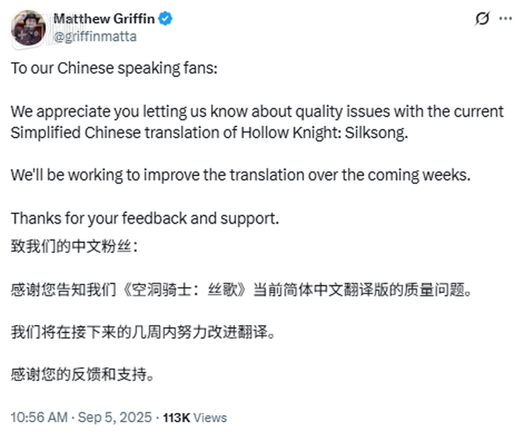 对于简中玩家反应激烈的本地化问题,《丝之歌》的回应倒是没有鸽。Team Cherry的市场营销与发行负责人Matthew Griffin,已经在自己的推特账号上做出了回应:团队将在接下来的几周内努力改进中文翻译问题。