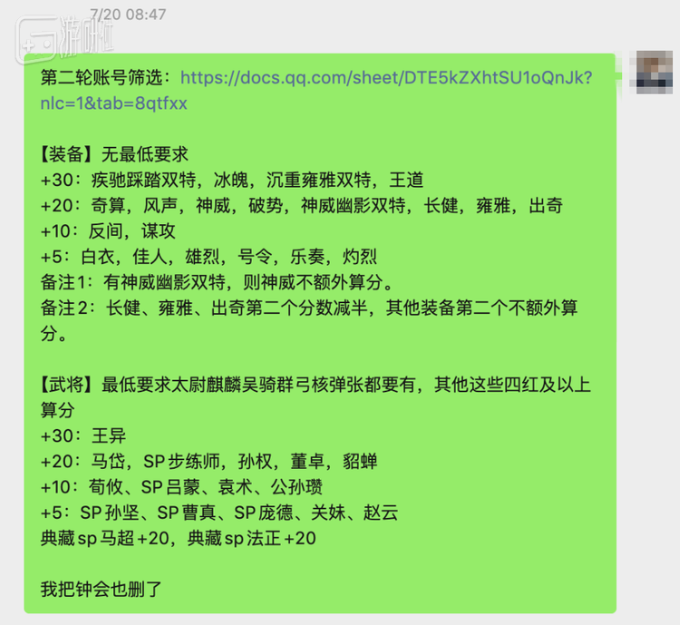 进行账号筛选时,白板大王的同盟为所有成员分发了问卷,要求截图自己的武将和装备情况,再由战队管理创建一套通用的评分算法,最后根据直观数字评分依次排名,决定出参赛账号。这样的筛选机制基本杜绝了只想混个比赛经历的“关系户账号”,而是最大程度确保了队伍的强度,白板大王提到,其本人的账号其实算是卡在了标准线的尾巴上,但“压根就没给它进(比赛)”。