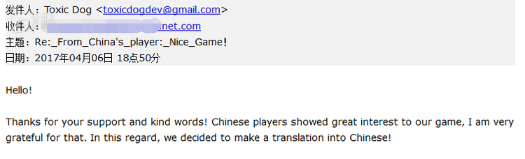 在昨天发现这款奇葩游戏之后,游研社第一时间联系了制作组Toxic Dog。听说我们是来自中国的媒体后,对方非常开心,立刻表示感谢关注,并承诺在游戏中加入中文。