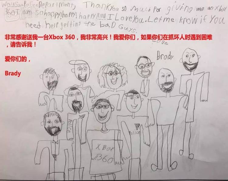 布雷迪高兴的捧着这台Xbox 360,与在场警官拍照留念,并在回家后根据照片画了一幅画回送给警局,还在上面写道:“非常感谢你们送我一台Xbox 360,我非常高兴,我爱你们,如果你们在抓坏人时遇到困难,请告诉我!爱你们的布雷迪。”