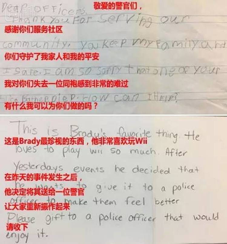另外一张字条应该是出自布雷迪父母之手,上面写着:“这是布雷迪最珍视的东西,他非常喜欢玩Wii,在昨天的事件发生之后,他决定将其送给一位警官,让大家重新振作起来,请收下。”
