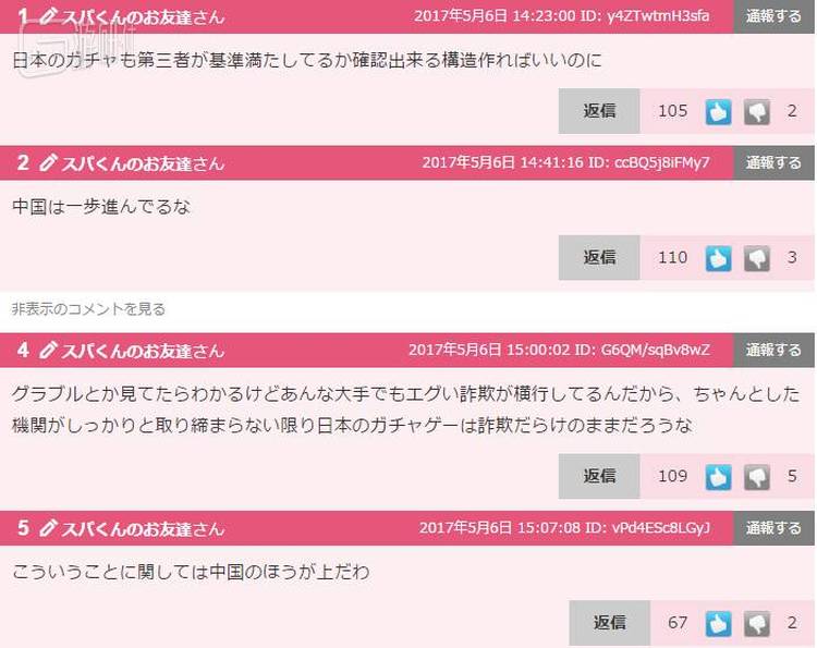 目前在日本,并没有强制性的法律要求手游厂商明示游戏中抽卡的出现率等赌博性质活动的具体数字,而正如大家所知,在本月1日,我国的相关法律已经开始正式施行,作为抽卡手游大国的日本自然也不会错过这个消息。在经过媒体报道之后,参与讨论的日本玩家大多留下了羡慕嫉妒或者是恨铁不成钢的评论:
