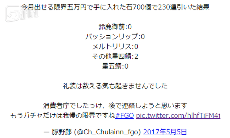 文中他表示,在花了5万日元购买了700个宝石并连续抽了230次卡后,统共只获得了两张4星卡,对这个结果明显不满意的豚君想到了平时基本没怎么关注过的日本消费者厅(相当于咱们这的消协),并明确表示要告“御状”。