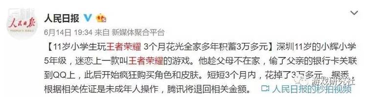 到了6月,事情开始起变化,陆续有负面的社会新闻伴随着“王者荣耀”四个字出现。类似的新闻你总看到过一些,仅就《人民日报》官博,在一个月的时间内,就发布了4条与《王者荣耀》有关的微博,且无一例外与负面事件关联。