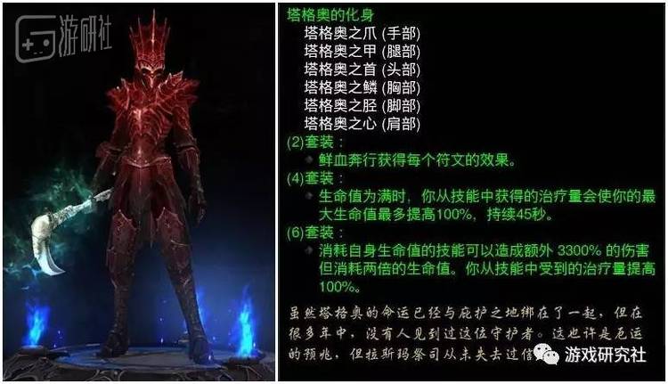 比如暗黑2死灵法师的专属套装“塔格奥的化身”,这是塔格奥这个名字第一次出现在游戏中。在暗黑2的设定里,塔格奥还不是如今伟岸的神明形象,而是一条带毒的巨龙。一位传说中的英雄杀死了塔格奥,用它的鳞片制作了这套装备。很多玩家应该都记得,如果死灵法师穿齐了这个套装,你的角色形象将会变成一只吸血鬼,能够释放流星、火墙和火球,还会有施法速度变慢的负面效果。