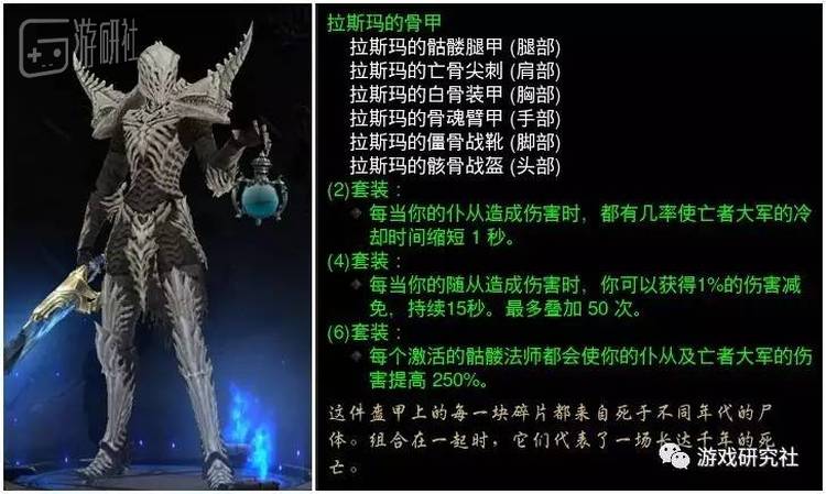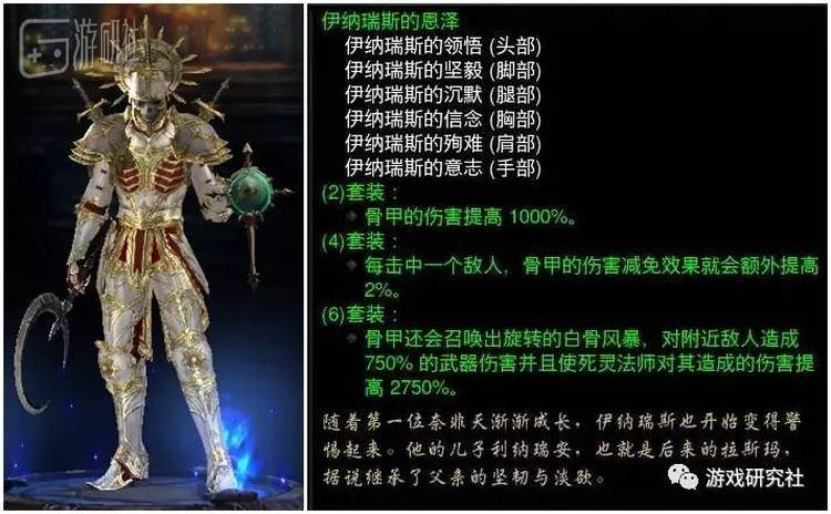 骨系死灵法师的套装是“伊纳瑞斯的恩泽”,这是来自大天使的名字。物品描述中说,伊纳瑞斯的儿子利纳瑞安(拉斯玛的本名)继承了父亲的坚韧与淡欲,这正是所有死灵法师都具备的特点。套装的外形也彰显出了来自天堂的力量——头顶光环,背负圣剑。