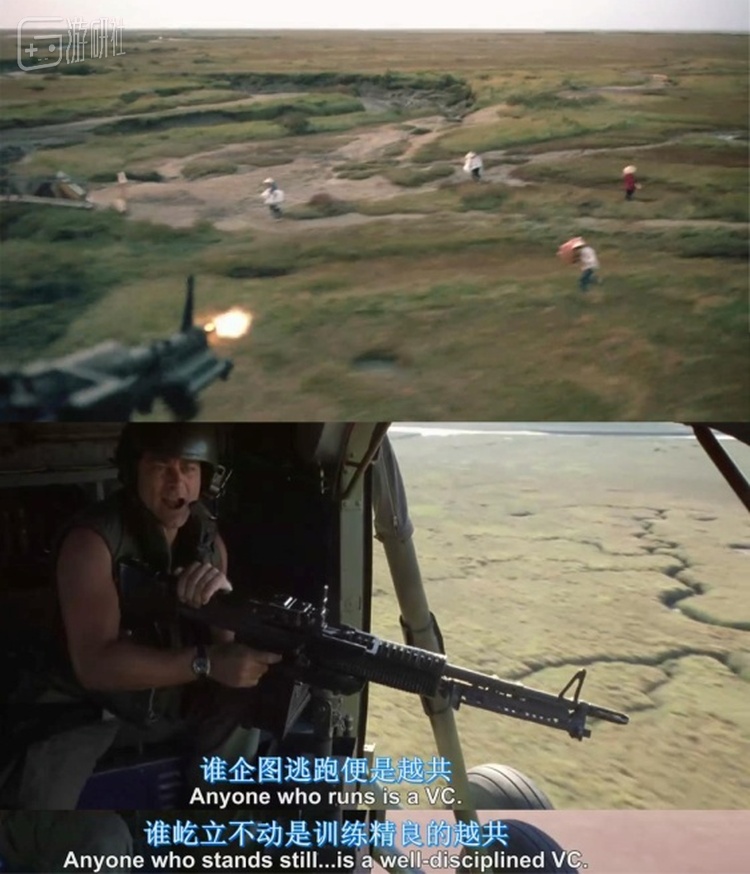 说回电影,前半未上战场已如此扭曲,那么上了战场又会迎来什么?”全金”在军训之后的战场段落里,给出了诸多一反正面的大胆描绘——美军士兵向平民机枪扫射,带有极大偏见甚至努力制造新闻的军队报道,集体招女支,面对摄像头虚伪做作等等,各种对普通观众来说看似离谱,但转念想想于战时却相当平实的内容,无不令久居和平的人触目惊心。