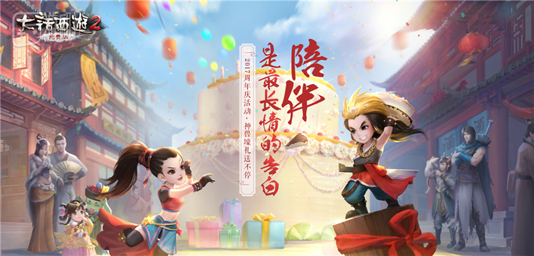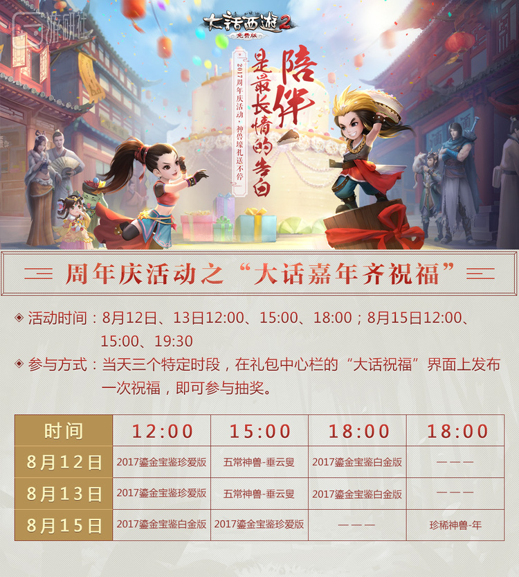陪伴是最长情的告白,《大话西游2免费版》2017周年庆活动火热来袭,海量福利上线得,珍稀道具天天有,神兽-年、神兽-垂云叟、2017鎏金宝鉴、黄宝石、八荒遗风、聚魄丹、高级古阵残页、龙之骨等丰厚奖励等你赢取!活动连续四周,本周活动将于8月12日至8月15日期间开启,12日、13日、15日三天更有特别福利!此外,新服【岁月如歌】今日开启,虚席待君至!