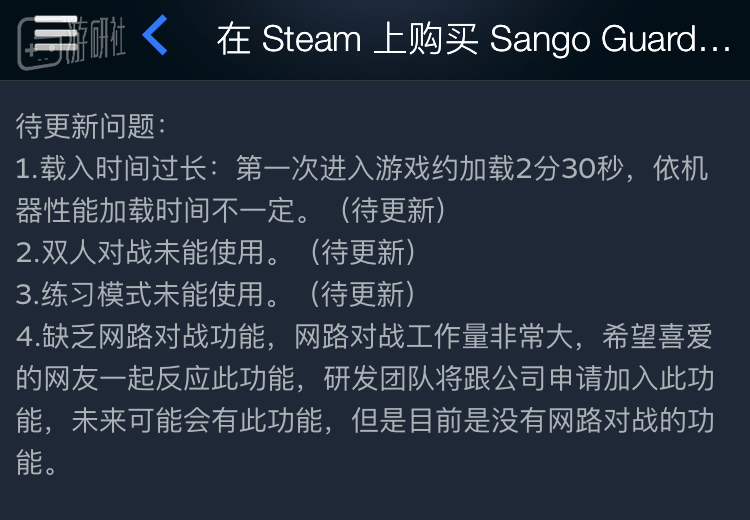 不过如今的Steam页面的下方依旧有一些“待更新问题”的说明,这其中包括:载入时间过长、双人对战未能使用、练习模式未能使用以及缺乏网路对战功能。也就是说,现在能玩的只有一个“剧情模式”,而所谓的剧情模式就是指选人之后和随机的AI对手对战。