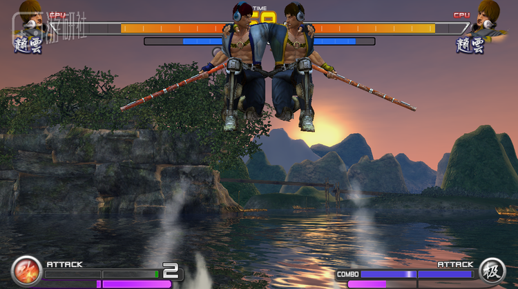 就在我打下这些字的时候,游戏开始了自动演示。伴随着中国风BGM,系统自动选了两个手持长棍的赵云开始对战,动作很像《KOF》中的比利。演示不算流畅,有时候还会出现不太正常的贴图。