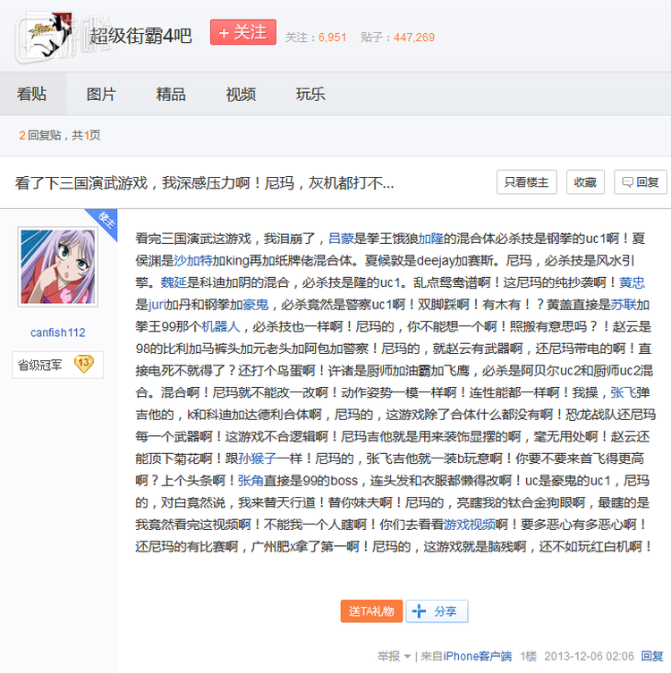 但不知出于什么原因,制作方决定将游戏搬上PC平台。可惜PC玩家不像电玩城的路人那么容易糊弄——能关注到这种冷门格斗游戏的,一般都是老炮,于是就出现了前文贴吧玩家的炮轰局面。