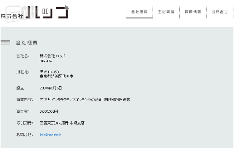 根据其官网显示的信息,Hap Inc.注册资本只有500万日元,折合30万人民币。这对比那些动辄几千万制作成本,几千万请明星代言来开发一款手游的公司来讲,可谓非常寒酸了。