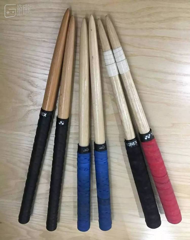 除去鼓面三件套,太鼓达人街机框体还有一个消耗品:鼓棒。同样的问题,原厂木质鼓棒(公棒)材料做工逐渐缩水损耗严重,街机厅的机修们开始拿莫名其妙的东西替代,常见橡胶棒塑料棒,甚至有的直接上擀面杖。公棒成了一个必须迈过的门槛,太鼓玩家则有两个选择:寻找合适的替代品,或者自己做私棒。