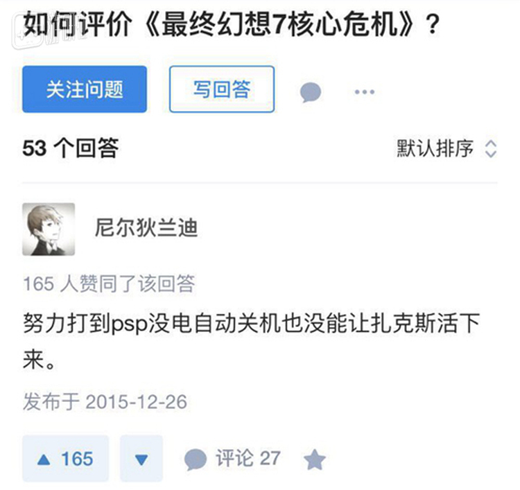 这是所有玩到终章的玩家最印象深刻的一幕,无数玩家曾通过练级、不断杀敌的方式试图改变故事的结局。在知乎的“如何评价《最终幻想7:核心危机》”问题里,票数最高的一个答案是:努力打到PSP没电自动关机,也没能让扎克斯活下来。