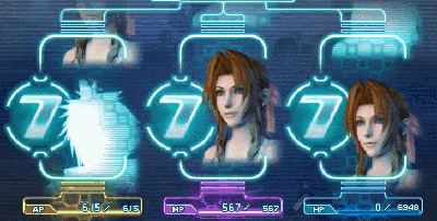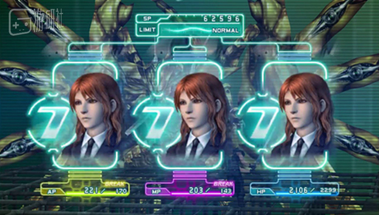 这是一个类似老虎机的轮盘界面,当扎克斯的“战士点数”不低于10时即可触发随机转动,出现不同的图案则可以释放不同招式技能,比如转到萨菲罗斯头像就是强力技能“八刀一闪”,当大转盘出现“777”数字时扎克斯便会升级。