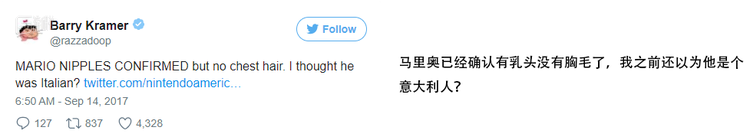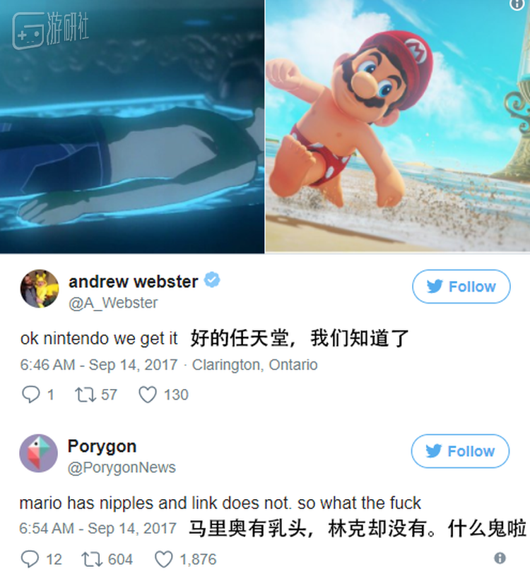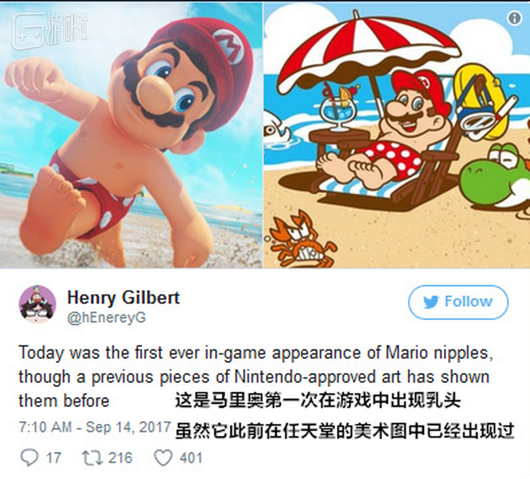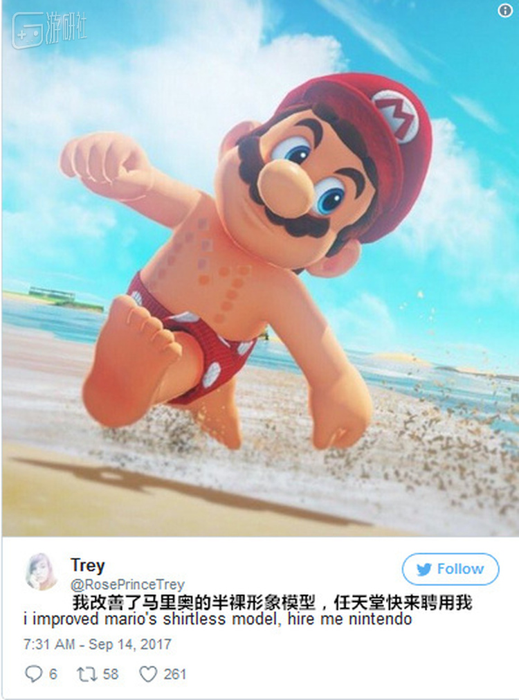 在这段视频中,有一段马里奥穿泳裤,半裸上身的造型,引发了很多国外网友的讨论。不过显然他们关注的重点不是游戏本身,而是集中在了马里奥上身的“两点”上: