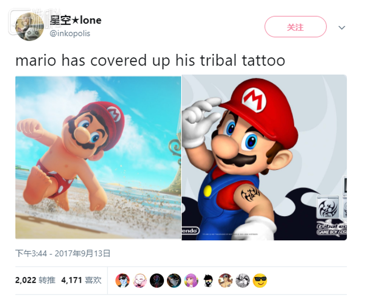 2004年任天堂曾经发售过一款马里奥限定版的GBA SP掌机,在当时的广告中,马里奥第一次露出了手臂,上面还有一个纹身。当时很多人看到之后都十分震惊,马里奥居然有纹身。但是在这次的最新宣传动画中,这个纹身也消失了。这一细节也被网友们发现了。