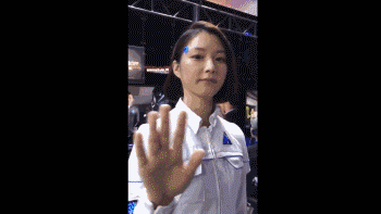 现场展示的这些“机器人”有几台已经启动了,它们被安置在开放区域内,供玩家亲自体验。它可以针对观众们的行为作出简单的表情和动作,就像这样: