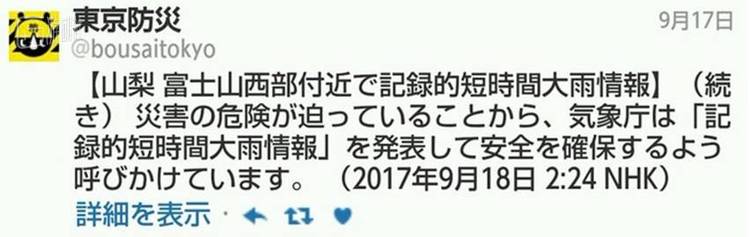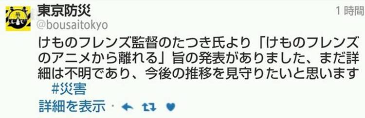甚至,连一直都只在公布日本灾害信息的“东京防灾”官推,也煞有介事的报道了たつき监督被撤换的新闻,并在后边标注上了“灾害”二字。