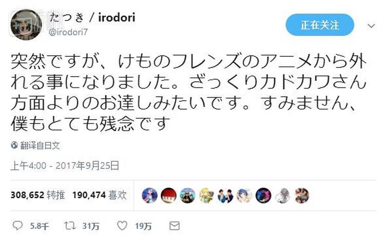 事发突然,我要脱离《兽娘动物园》动画的制作了,大概就是角川那边的意思。对不起大家,我自己也深感遗憾。