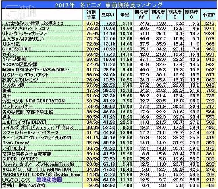 2017年日本冬季动画期待度排名,《兽娘动物园》倒数第二,垫底的那个《灵剑山》你们可能也认识
