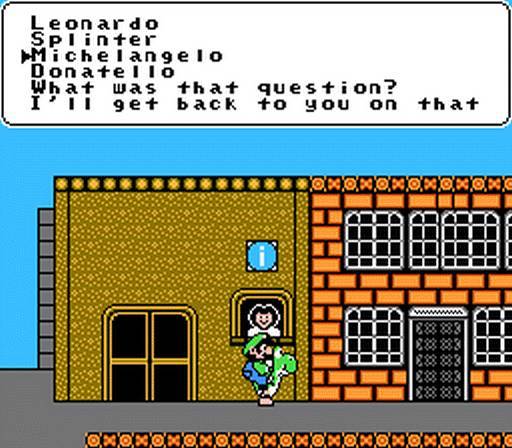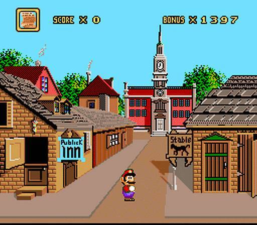 反倒是游戏的NES版异常简单粗暴——玩家通过击败每个房间里刷出来的库巴喽啰获得文物,然后于对应的关卡里敲击特殊的砖块来了解文物相关的信息,接着再将文物放在指定位置即算完成任务(如果放错了,库巴手下的乌鸦会将文物叼走,而玩家得再挑战一次关卡),另外不得不提玩家挑战最终BOSS前还得回答三个同历史人物相关的问题(比如“爱迪生的绰号是啥?”)。总而言之,三大游戏版本中,数NES版无论画面还是内容均最为劣质。