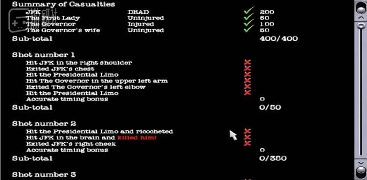 杀死肯尼迪,击伤康纳利州长,不要误伤两位夫人,这只是游戏最基本的四个“主线”目标,完成之后,玩家仅能获得400分。