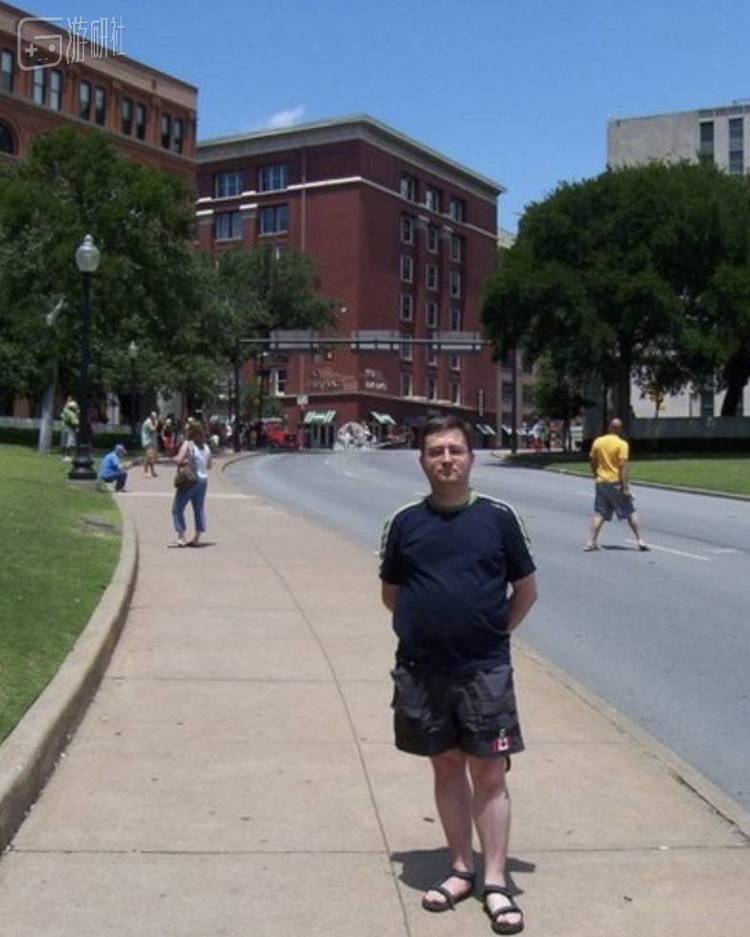 科克·艾文在当年刺案事发地的留影,在他身后的这栋红色建筑,就是奥斯瓦尔德当年藏身的教科书大楼