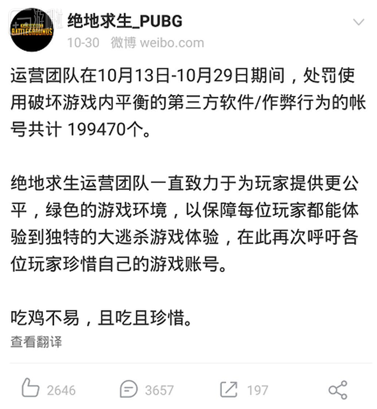 部分玩家反映,虽然近期外挂现象有所收敛,但各种隐蔽的作弊方式依然层出不穷,游戏体验并无明显改善。根据《绝地求生》官方微博的通告,从7月份至今蓝洞已经封禁了41万余个作弊账号。如此规模的开挂现象,让这个技术实力不算出色的公司疲于奔命。